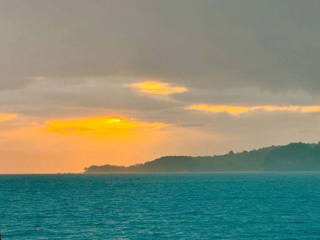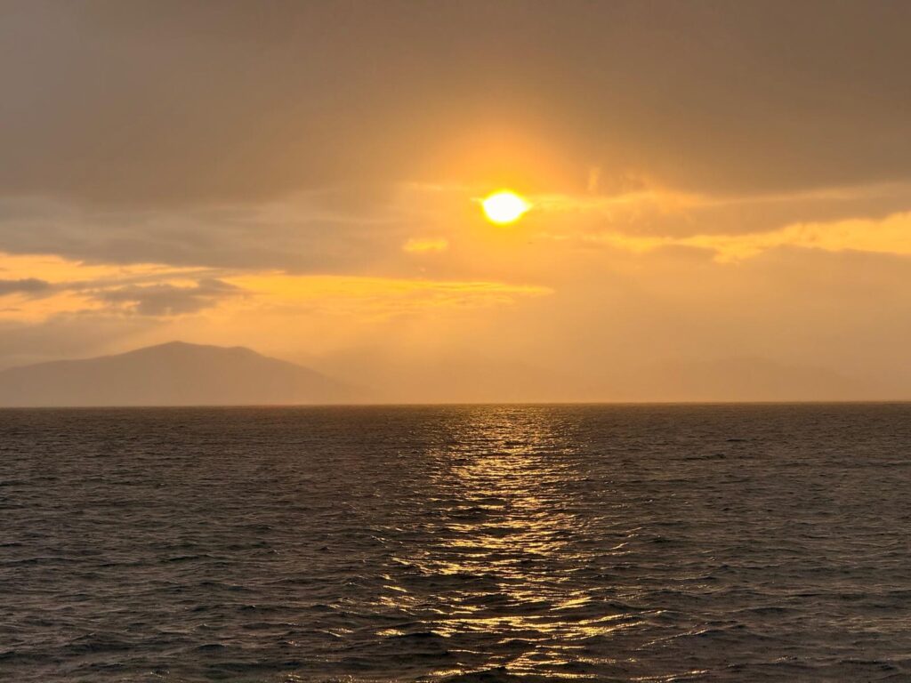 Um 07.00 hiess es Rise Rise – der Sonnenaufgang kündigte einen herrlichen Tag an. Um 08.30 warfen wir die Leinen los und führen mit Motor aus der Bucht. Zu Mittag frischte der Wind auf und die Segel konnten gesetzt werden. Mit raumen Wind mit 15 Kn rauschten wir mit 8 Kn Fahrt Richtung Mesolongi. Um 17.00 waren die Leinen im neuen Heimathafen der Ripa Blu fest. Die Marina ist etwas anders als die bisher besuchten Häfen. Es sind vor allem Eignerjachten, die hier über den Winter liegen und sehr viele sind auch bewohnt. Zentrum ist die Hafenkneipe, wo jeweils am Freitag eine Seglerparty veranstaltet wird. Wir werden bei Gelegenheit berichten. Am Abend gab es die Arrival Party an Bord mit allem, was die Bordküche und der Weinkeller noch zu bieten hatte.